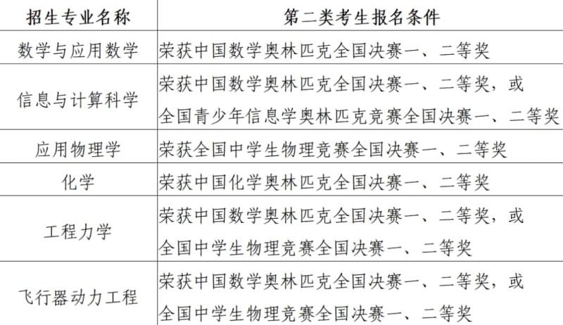 榮獲全國(guó)青少年學(xué)科奧林匹克競(jìng)賽(數(shù)學(xué)、物理、化學(xué)、信息學(xué))全國(guó)決賽一、二等獎(jiǎng)。全國(guó)青少年學(xué)科奧林匹克競(jìng)賽獲獎(jiǎng)學(xué)生以全國(guó)青少年科技競(jìng)賽獲獎(jiǎng)名單公示網(wǎng)站(http://gs.cyscc.org/)公示的名單為準(zhǔn)。各招生專業(yè)對(duì)應(yīng)的報(bào)名條件如下表所示。