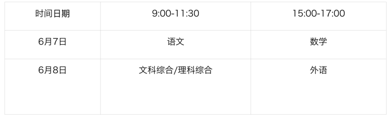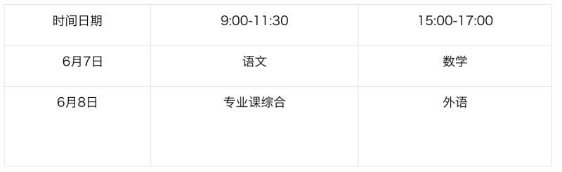 2.高職對口招生文化課考試  高職對口招生各類別考試于6月7日至8日舉行,各科目考試時間安排如下: