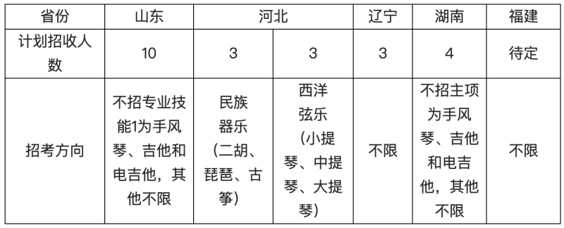 注:考生報(bào)名參加所在省2023年音樂類專業(yè)統(tǒng)考,考試科目以各省級(jí)招生考試機(jī)構(gòu)公布的為準(zhǔn),我校不再另行舉行專業(yè)測試。以上計(jì)劃如有調(diào)整,以省級(jí)招生考試機(jī)構(gòu)下達(dá)的正式文件為準(zhǔn)。