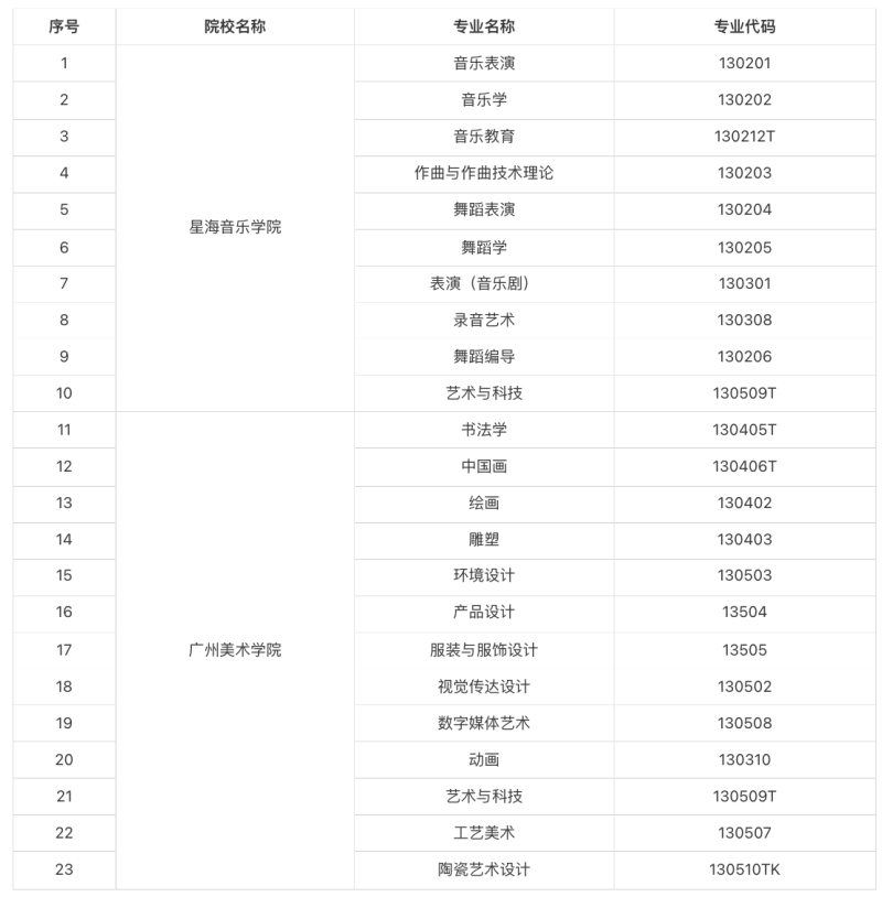 自2024年起,星海音樂學(xué)院的音樂表演等10個藝術(shù)類專業(yè)、廣州美術(shù)學(xué)院的書法學(xué)等13個藝術(shù)類專業(yè)(詳見附表),可在省級統(tǒng)考合格基礎(chǔ)上組織???。省內(nèi)其他普通高等學(xué)校(含部委屬、省屬等)的藝術(shù)類專業(yè)不再組織???。如有調(diào)整,另行公布。
