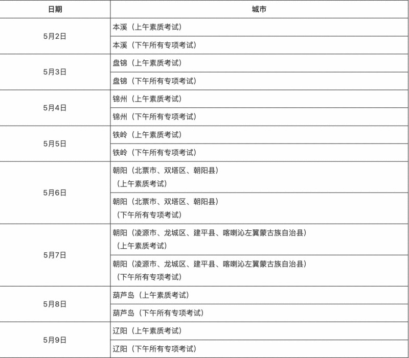 根據(jù)《遼寧省2022年普通高等學(xué)校招生體育專業(yè)考試新冠肺炎疫情防控工作預(yù)案》的要求,鑒于目前丹東市出現(xiàn)新冠肺炎疫情,現(xiàn)對我省2022年普通高校招生體育專業(yè)考試日程安排進行如下調(diào)整,望考生周知,并據(jù)此時間做好考前準(zhǔn)備。