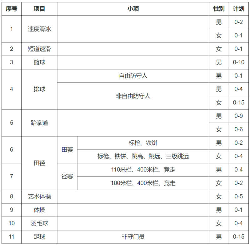 夏季項目:籃球、排球、跆拳道、田徑、藝術體操、體操、羽毛球、足球
