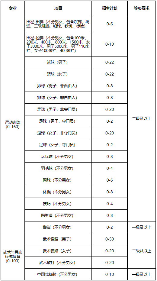 注:以上計劃為預(yù)定計劃(含優(yōu)秀運動員免試入學(xué)招生計劃),正式計劃以教育部、國家體育總局下達為準。