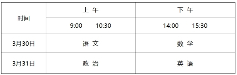(六)文化考試科目為語文、數(shù)學(xué)、政治、英語四科,每科滿分為150分,四科滿分為600分,使用國家通用語言文字作答。文化考試時間: