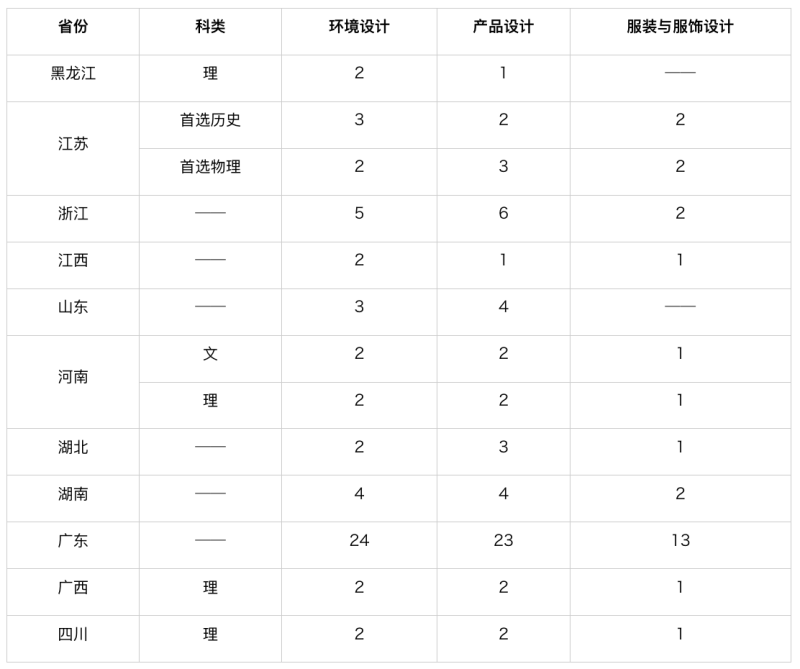 2024年我校設(shè)計(jì)學(xué)類專業(yè)總計(jì)劃為140人,其中,環(huán)境設(shè)計(jì)專業(yè)計(jì)劃招收56人,產(chǎn)品設(shè)計(jì)專業(yè)計(jì)劃招收56人,服裝與服飾設(shè)計(jì)專業(yè)計(jì)劃招收28人,分省計(jì)劃見下表: