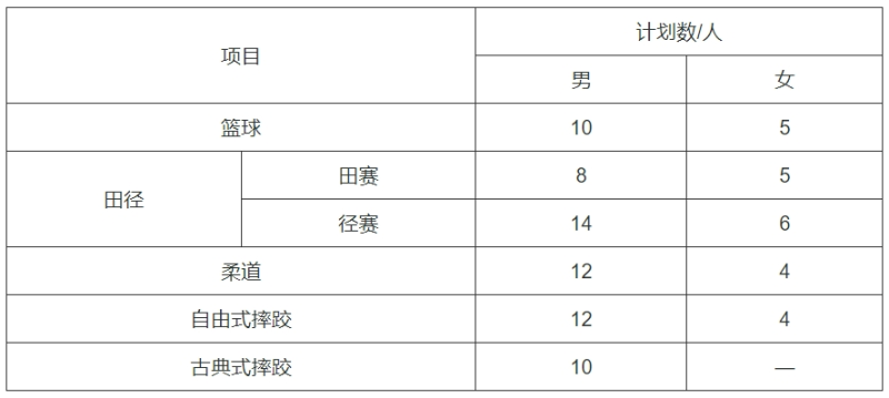 招生項(xiàng)目:籃球、田徑、柔道、摔跤(自由式、古典式),分項(xiàng)目擬招生計(jì)劃如下表所示(最終計(jì)劃以上級(jí)主管部門(mén)批復(fù)的為準(zhǔn))。
