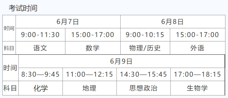 高考總共有3天,從6月7日開始,至6月9日結(jié)束。