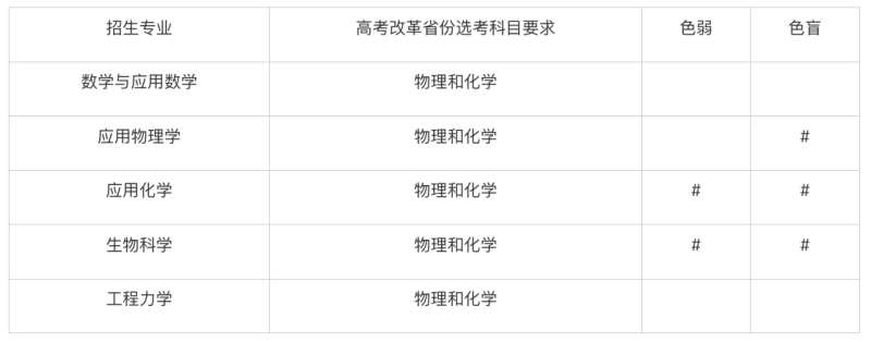 我校招生專業(yè)包括數(shù)學與應(yīng)用數(shù)學、應(yīng)用物理學、應(yīng)用化學、生物科學和工程力學。所有招生專業(yè)在非高考改革省份招收理科考生,在高考改革省份選考科目要求見下表: