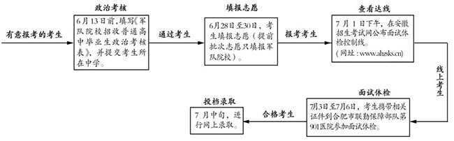 6月13日前,普通高級(jí)中學(xué)組織有報(bào)考軍隊(duì)院校意愿的考生填寫《軍隊(duì)院校招收普通高中畢業(yè)生政治考核表》(可在安徽招生考試網(wǎng)〈www.ahzsks.cn〉下載)??忌鷳?yīng)如實(shí)填寫表格中相關(guān)個(gè)人信息。6月27日至28日,考生可向當(dāng)?shù)乜h(市、區(qū))人民武裝部查詢政治考核結(jié)論,不合格或未參加政治考核的考生不符合報(bào)考條件。