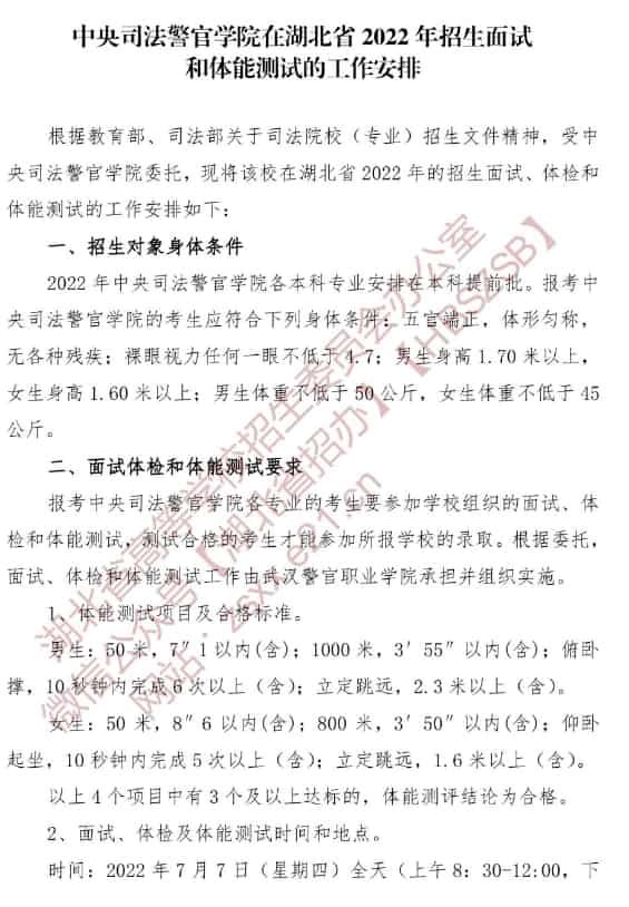 據(jù)悉中央司法警官學院在湖北省2022年招生面試和體能測試的工作安排已經(jīng)發(fā)布,具體如下: