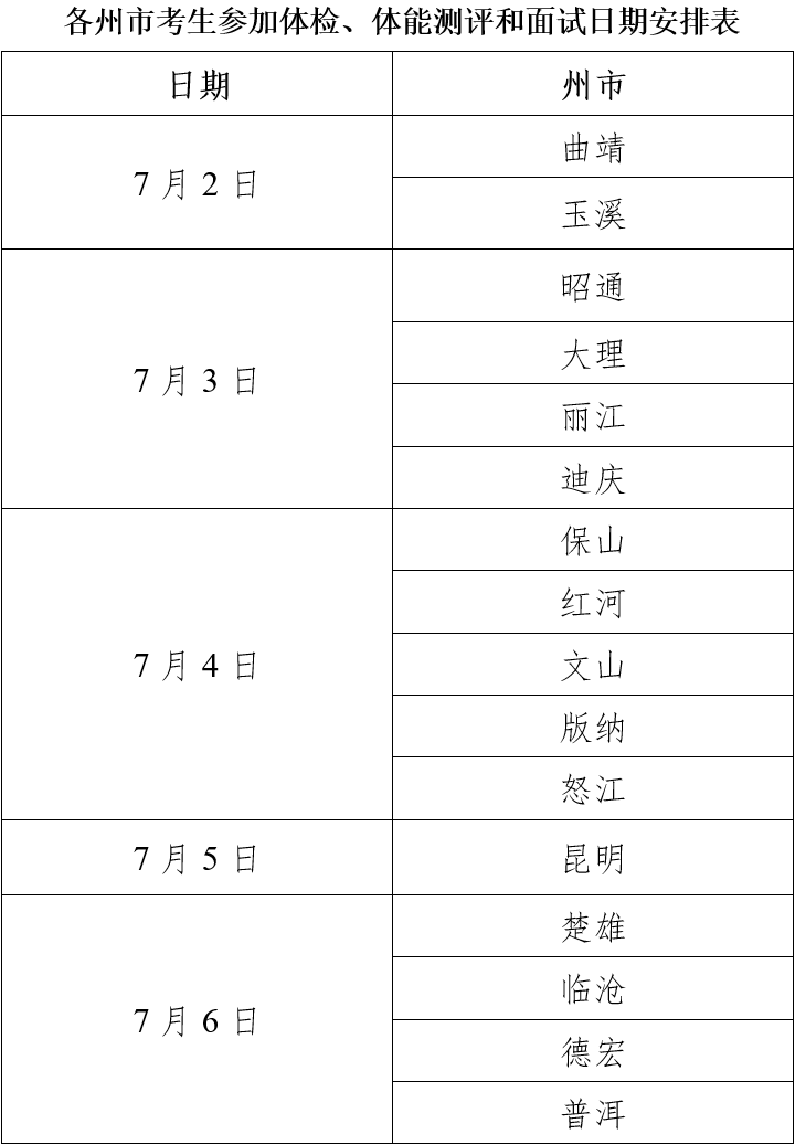 要求:請報(bào)考以上院校公安專業(yè)的考生,接到當(dāng)?shù)卣修k通知或云南省公安廳短信通知后,憑高考準(zhǔn)考證、身份證(或戶口簿),持5張一寸免冠近期照片(不限底色)以及經(jīng)考生本人和家長簽字的《考生個(gè)人健康承諾書》,著運(yùn)動(dòng)服和運(yùn)動(dòng)鞋按時(shí)參加體檢(勿需空腹)、體能測評和面試(三個(gè)項(xiàng)目同一天完成)。