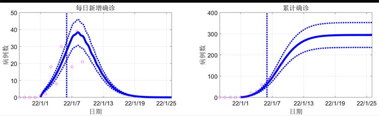 自2022年1月3日鄭州市報(bào)告新冠肺炎本土確診病例和本土無癥狀感染者以來,截至2022年1月9日24時(shí),鄭州市已累計(jì)報(bào)告確診病例92例(本土,數(shù)據(jù)來源:國家衛(wèi)健委,圖1的粉色圓圈代表實(shí)際數(shù)據(jù))。根據(jù)最新的疫情數(shù)據(jù),蘭州大學(xué)《新冠肺炎疫情全球預(yù)測系統(tǒng)》的初步預(yù)測結(jié)果顯示,在當(dāng)前政府采取的及時(shí)、有效的管控措施下(藍(lán)色實(shí)線),鄭州市本輪疫情預(yù)計(jì)將于2022年1月20日左右得到控制,累計(jì)確診病例數(shù)預(yù)計(jì)約177人(142-213,兩條藍(lán)色虛線之間)。