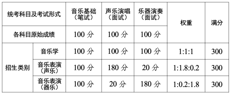 音樂類專業(yè)分音樂學(xué)、音樂表演(聲樂)、音樂表演(器樂)三個招生類別,統(tǒng)一考核音樂基礎(chǔ)筆試、聲樂演唱、樂器演奏三個科目,各科目均進行一次性考試,考試形式、分值和分方向的權(quán)重如下: