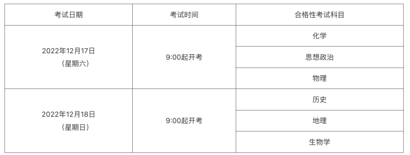 2022年12月開考思想政治、歷史、地理、物理、化學(xué)、生物學(xué)6門科目合格性考試。6科均采用機(jī)考形式,多科混排同時(shí)開考??荚嚂r(shí)間安排如下(具體考試時(shí)間以準(zhǔn)考證為準(zhǔn)):