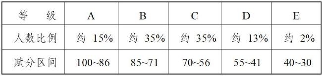 具體轉(zhuǎn)換步驟如下:第一步,按照每門選擇性考試科目考生的原始分從高到低劃定A、B、C、D、E共五個等級,各等級人數(shù)所占比例分別約為15%、35%、35%、13%和2%,將考生的原始分轉(zhuǎn)換成等級。第二步,將A至E五個等級內(nèi)的考生原始分,依照等比例轉(zhuǎn)換方法,分別對應(yīng)轉(zhuǎn)換到100~86、85~71、70~56、55~41和40~30五個分?jǐn)?shù)區(qū)間,得到考生的等級分。每門選擇性考試科目等級分?jǐn)?shù)的轉(zhuǎn)換基數(shù)為實際參加該科目考試并取得有效成績的人數(shù)。具體選擇性考試科目等級分轉(zhuǎn)換方法及示例如下: